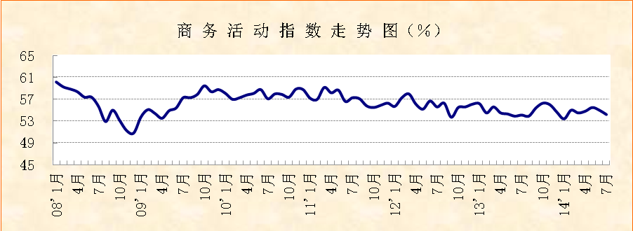 、国家统计局服务业调查中心发布的2014年7月份商务活动指数较上月回落0.8个百分点,达到54.2%。从各分项指数看,新订单指数与上月持平,新出口订单指数小幅回落,中间投入价格指数和收费价格指数双双回调,业务活动预期指数上升,市场运行保持平稳。