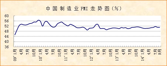 、国家统计局服务业调查中心发布的2014年9月份中国制造业采购经理指数(PMI)为51.1%,同上月持平。从主要分项指数来看,有升有降,生产、新出口订单指数有所上升,从业人员指数持平,产成品库存指数下降,大中型企业PMI指数稳中有升。结合前两月来看,三季度PMI指数平均水平为51.3%,略高于今年上半年和去年同期,显示三季度经济运行基本平稳,增速仍处在适度、合理区间。